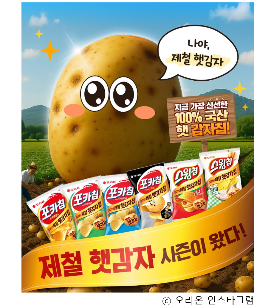 지난 5월 360레터에서는 '제철코어' 트렌드를 소개해 드렸는데요. 신선품이 아닌, 가공품에도 제철이 있다는 사실 알고 계시나요? 제철 햇감자를 사용해 특정한 기간에만 먹을 수 있는 오리온의 감자칩(포카칩, 스윙칩)이 SNS를 뜨겁게 달구고 있어요.