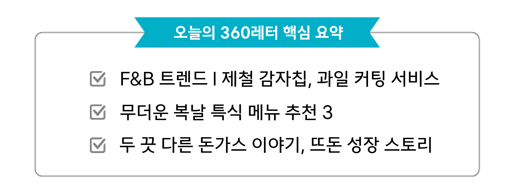 여러분은 무더운 7월을 어떻게 보내고 계시나요? 오늘의 360레터는 F&B 트렌드 뿐만 아니라 특별히 복날 추천 특식 메뉴도 함께 찾아왔어요. |