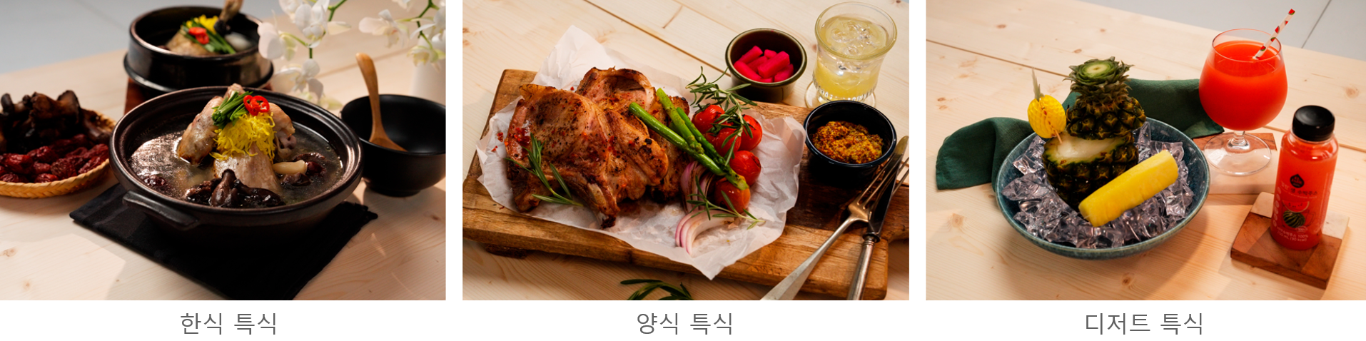 복날에 가장 쉽게 떠울릴 수 있는 메뉴는 바로 '삼계탕'일 텐데요. 여기에 면역력 증진 및 항산화 효과가 있는 능이버섯을 더해 푹 고아낸 능이삼계탕🍗은 더위에 지친 기력을 보충해 줘요. 그리고 함께 구성한 보쌈두부김치는 부드러운 두부, 촉촉한 수육, 매콤한 김치가 어우러져 입맛을 돋우는데요. 한식 특식으로 구성한 두 메뉴는 단백질을 비롯한 영양 밸런스가 우수해 여름 특식으로 제격이에요. |