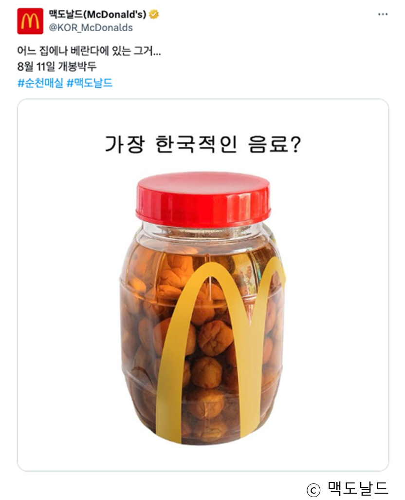 한국 맥도날드가 8월, 전남 순천에서 재배한 매실을 활용한 음료 순천 매실 맥피즈를 출시했어요. 맥도날드는 그동안 보성 녹차, 진도 대파, 창년 마늘, 익산 고구마 등 로컬 특산물을 활용해 '한국의 맛' 캠페인을 이어왔는데요.