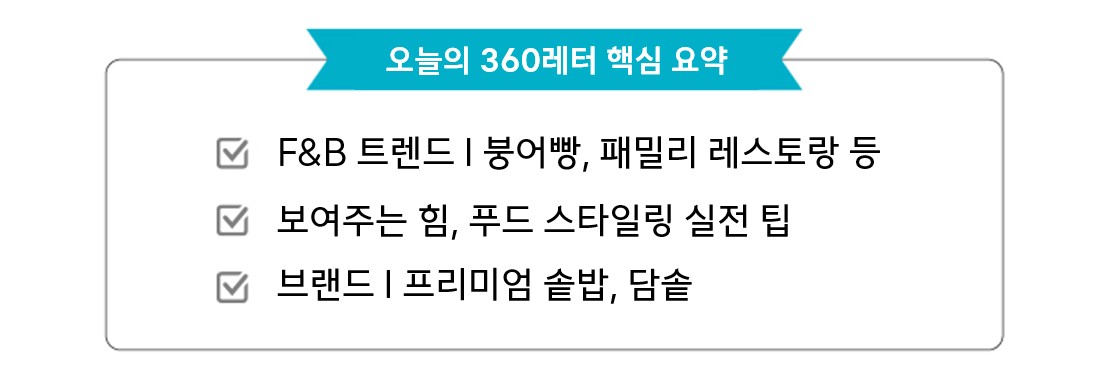 이번 360레터에서는 F&B 트렌드뿐만 아니라, 푸드 스타일링 교육 영상, 그리고 건강하게 맛있는 프리미엄 솥밥 '담솥'의 성장 스토리까지 준비해 보았는데요. 업계의 다양한 인사이트를 담았으니, 모두 주목해 주세요! 😎 |