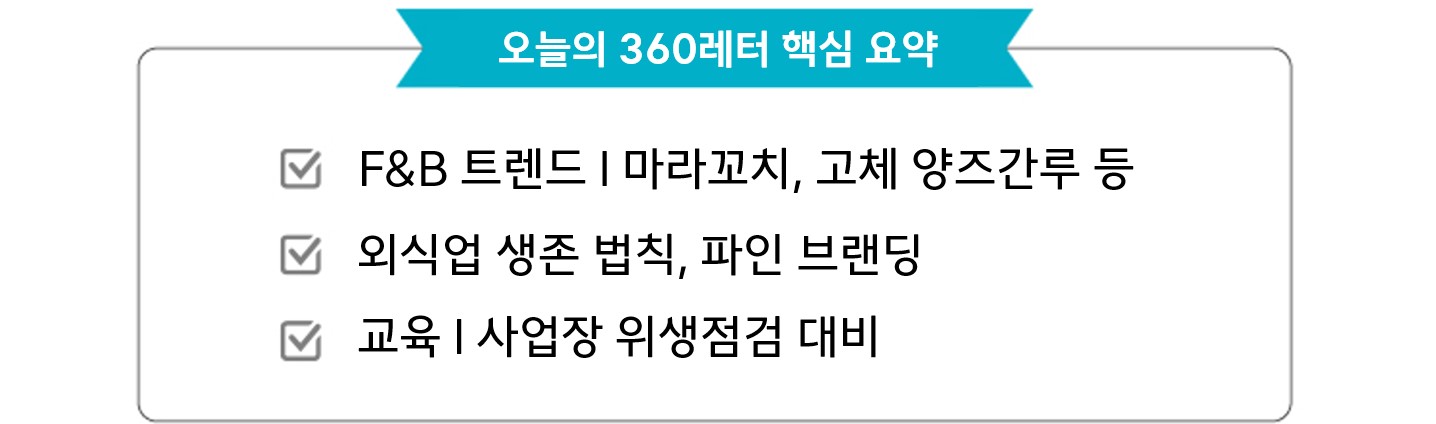 이번 호에서는 최신 F&B 트렌드, 외식업 생존의 새로운 법칙 '파인 브랜딩', 그리고 위생점검 대비 교육 영상을 준비했어요. 업계 인사이트가 가득하니 끝까지 함께해 주세요!🤩 |