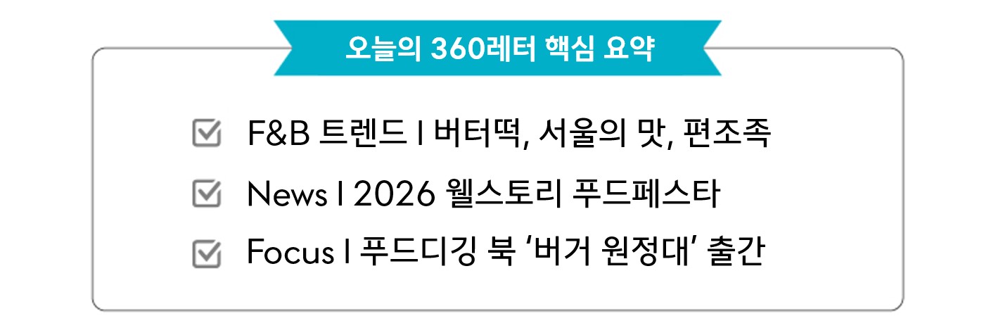 SNS를 새롭게 달구고 있는 '버터떡'과 외국인 관광객 취향 저격을 위한 '서울 테마 음료', 직장인 아침 문화를 바꾸고 있는 '편조족' 트렌드를 알려드려요. 더불어 F&B 바이블이 될 '버거 원정대' 출간과 식음 업계 최대 규모의 비즈니스 박람회 '웰스토리 푸드페스타' 행사 소식을 전달드립니다. |